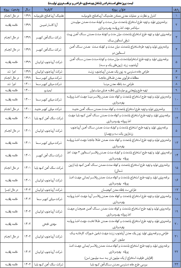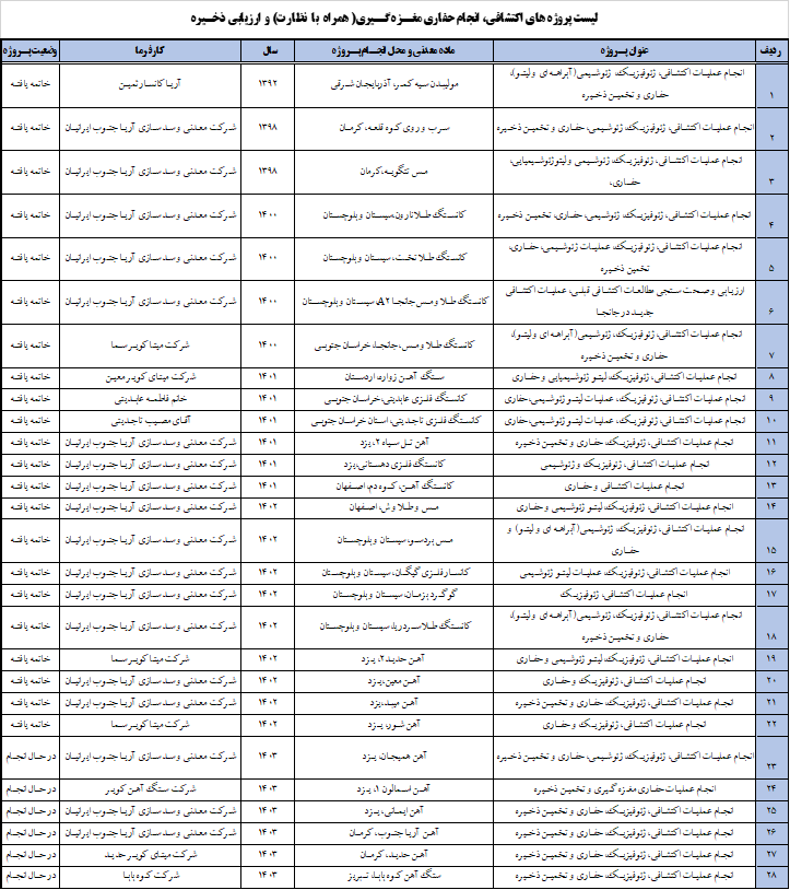 لیست پروژه های اکتشافی، انجام حفاری مغزه گیری (همراه با نظارت) و ارزیابی
