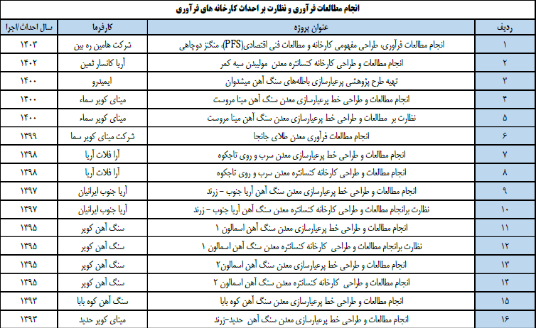 - ارائه خدمات مهندسی در خصوص طراحی و بهرهبرداری از کارخانههای کنسانتره؛